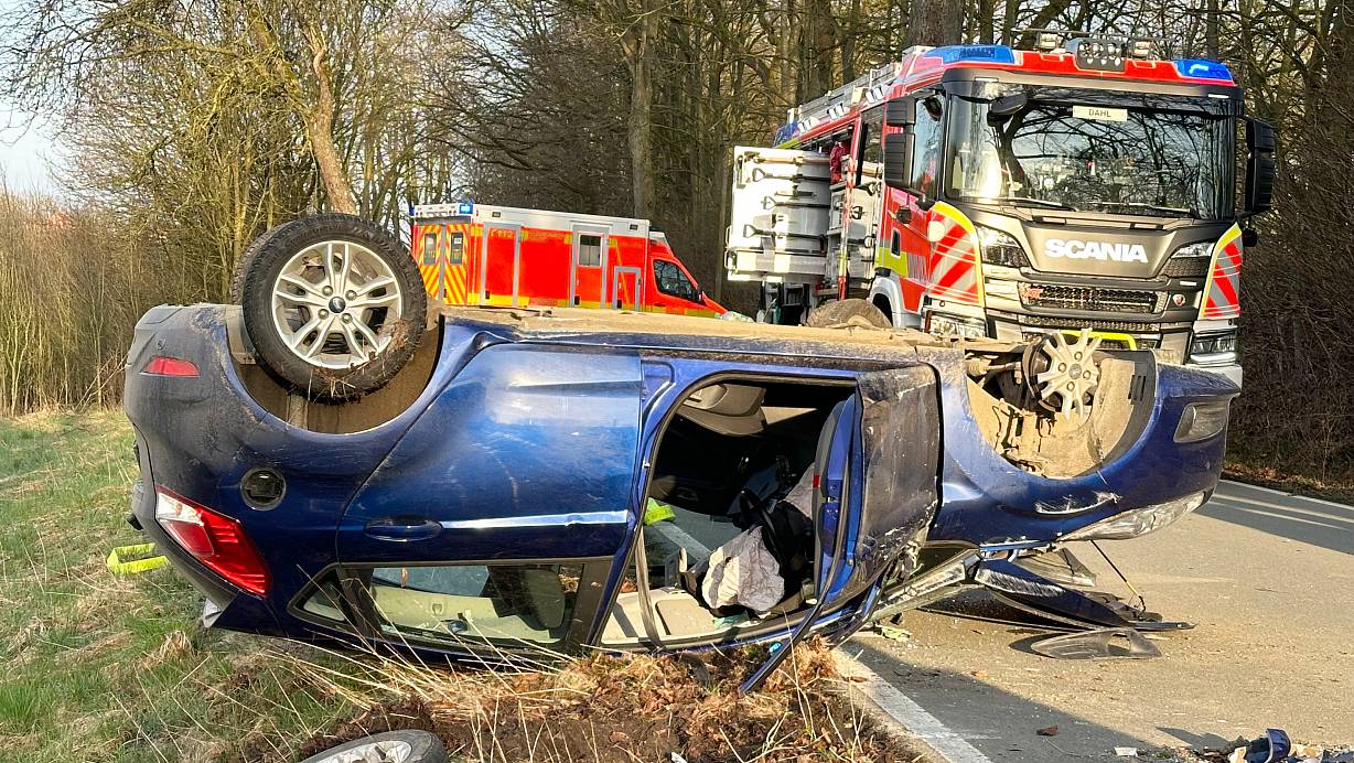 Zerstörter Ford Fiesta bleibt bei Paderborn Ortsteil auf dem Dach liegen
