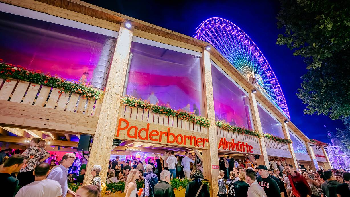 Die Paderborner Almhütte hat eine Fläche von 40 mal 25 Meter und bekommt wie schon 2023 eine zweite Etage. Wie im vergangenen Jahr wird es circa 800 Sitzplätze auf beiden Ebenen geben. Hinzu kommen 400 bis 500 Stehplätze an Stehtischen und noch einmal 250 Sitzplätze im vorgelagerten Biergarten.