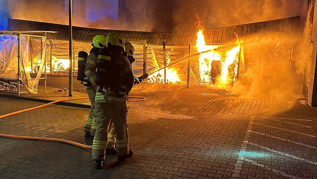 Die ersteintreffenden Kräfte sahen vor Ort eine 80 Quadratmeter große Garage, die voll in Brand stand. Sie wurde als Fahrradunterstand und Lager genutzt. Durch die umgehend eingeleitete Brandbekämpfung mittels zweier handgeführter Strahlrohre und einem Wasserwerfer von der Drehleiter, konnte eine Ausbreitung auf das angrenzende Hotel verhindert werden.