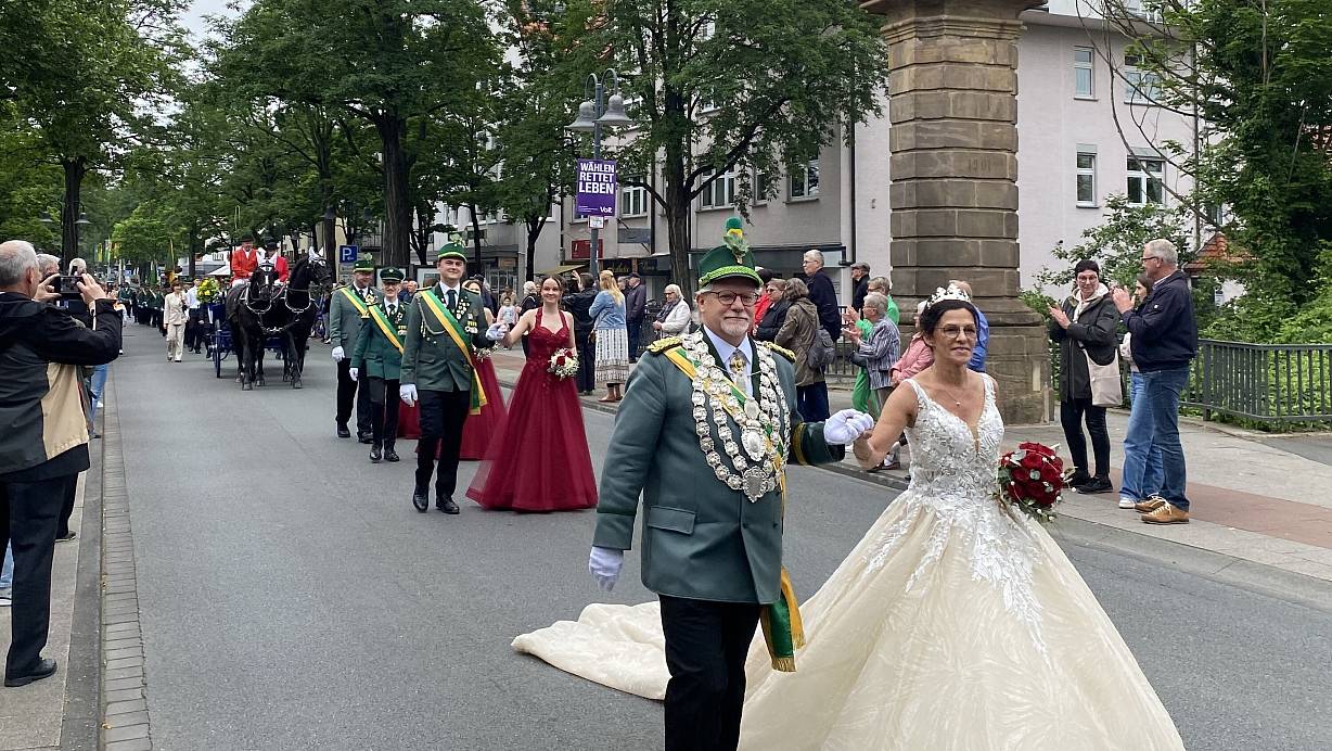 Der Umzug bildet den Höhepunkt des Schützenfest-Sonntages im Paderborner Ortsteil Schloß Neuhaus – mittendrin das Königspaar Markus und Monika Husemann.