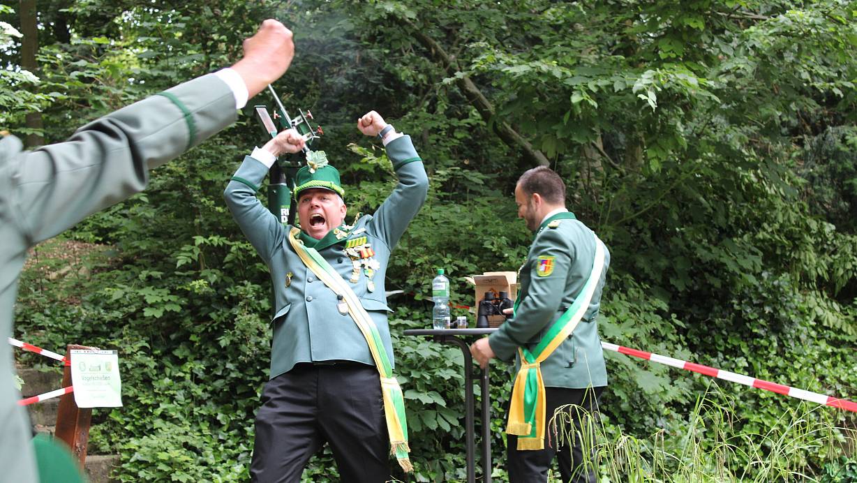 Der neue Schloß Neuhäuser Schützenkönig Markus Pollmeier bejubelt seinen Sieg unmittelbar nach dem finalen Schuss. | © Moritz Jülich