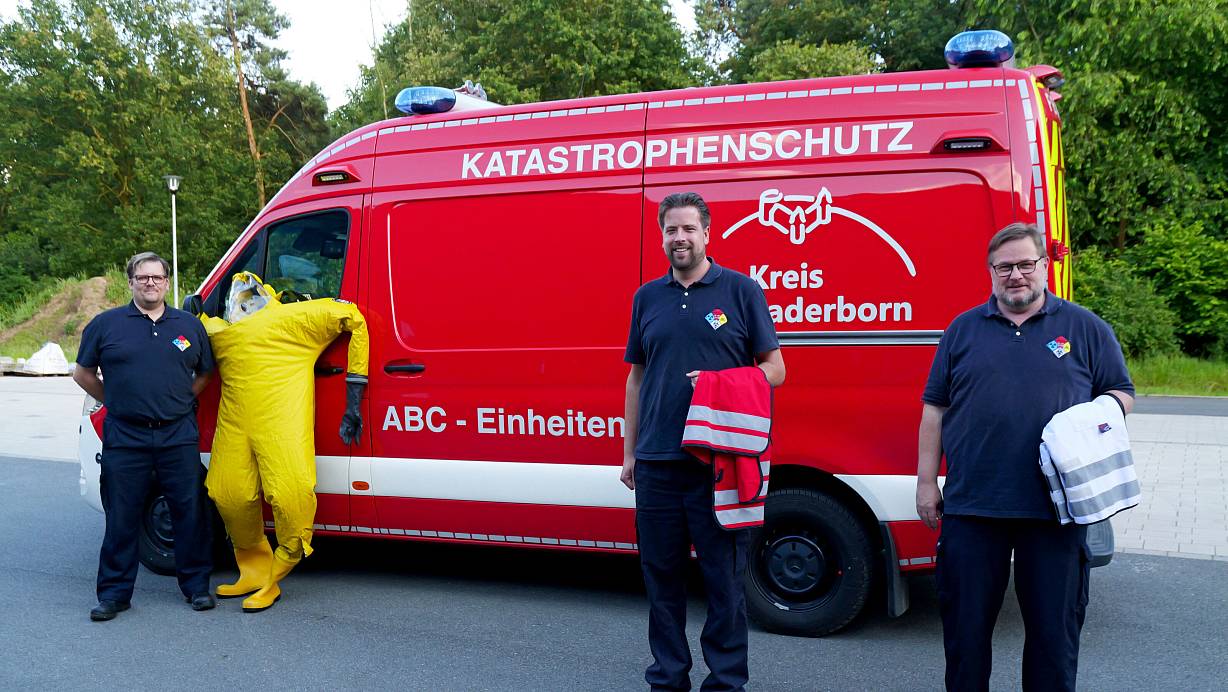 Bereit für den EM-Einsatz sind die ABC-Einheiten des Kreises mit Maik Sellemerten (v. l.), Benedikt Schmertmann und Carl Wübbe vor dem Führungsfahrzeug der Teileinheit Gefahrenabwehr. | © Ralph Meyer