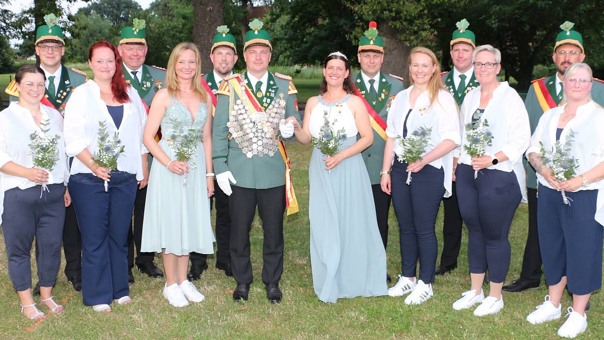 Zu ihrem Hofstaat gehören sechs weitere Paare, die mit ihnen das Schützenfest von Samstag bis Montag, 6. bis 8. Juli, feiern werden. Dies sind das Zeremonienmeisterpaar Alexandra und Christian Overrödder sowie die Hofstaatpaare Simone und Dirk Hansjürgen, Sarah und Franz Meyer, Sabrina und Thomas Lindhauer, Carina und Giuseppe Sgro sowie Katrin und Mike Macioßek.
