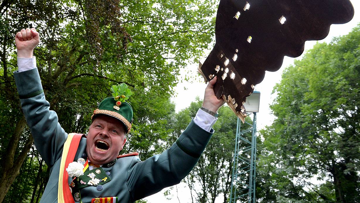 "Ein wahnsinniges Gefühl": Paderborns Schützenkönig Reinhard Hepers schreit 2014 seine Freude heraus und schwenkt triumphal die Reste des Adlers. | © Reinhard Rohlf (Archiv)