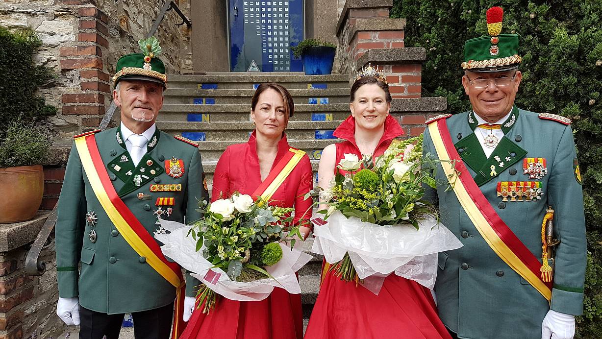 Schützenkönigin Nicole Paul (2. v. r.) freut sich mit der Zeremonienmeisterin Anne Voss (2. v. l.), Zeremonienmeister Michael Lohl (l.) und Kämper-Hauptmann Jürgen Lutter über den Besuch der von ihm geführten Zapfenstreich-Kompanie. | © Birger Berbüsse