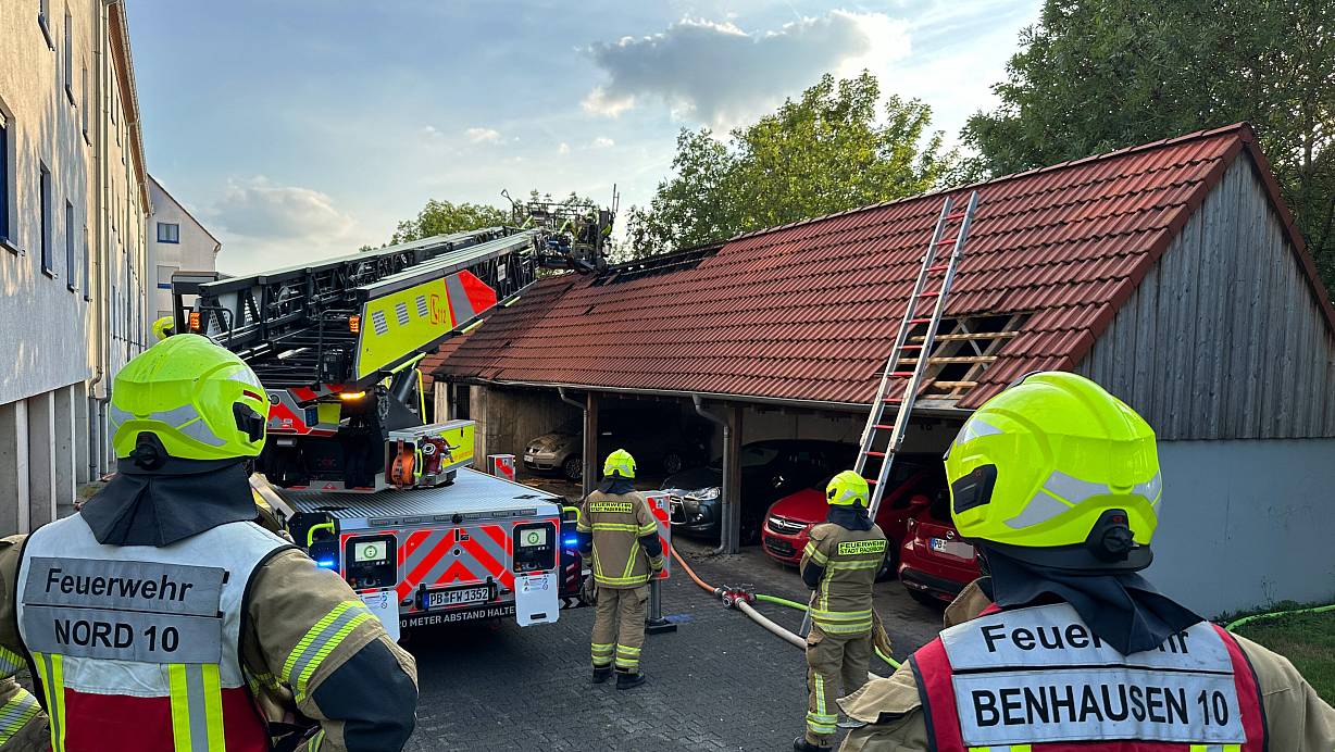 Rund 30 Feuerwehrleute löschten den Dachstuhlbrand in einer Fahrzeugremise auf dem Kaukenberg. | © Ralph Meyer