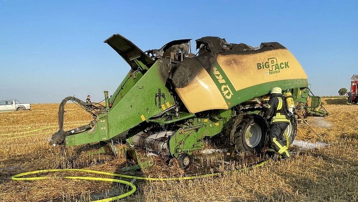 Bei Eintreffen der ersten Einsatzkräfte stand die Ballenpresse vom Typ Krone BigPack bereits im Vollbrand. Die Flammen hatten bereits auf das umliegende Getreidefeld übergegriffen.