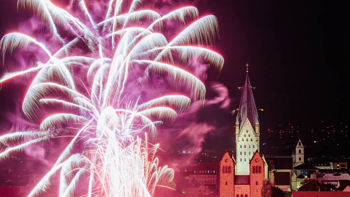 Dieser Blick aus dem Hotel Arosa zeigt das Feuerwerk zum Libori-Finale in Blickrichtung Paderquellgebiet und Dom. | © BESIM MAZHIQI