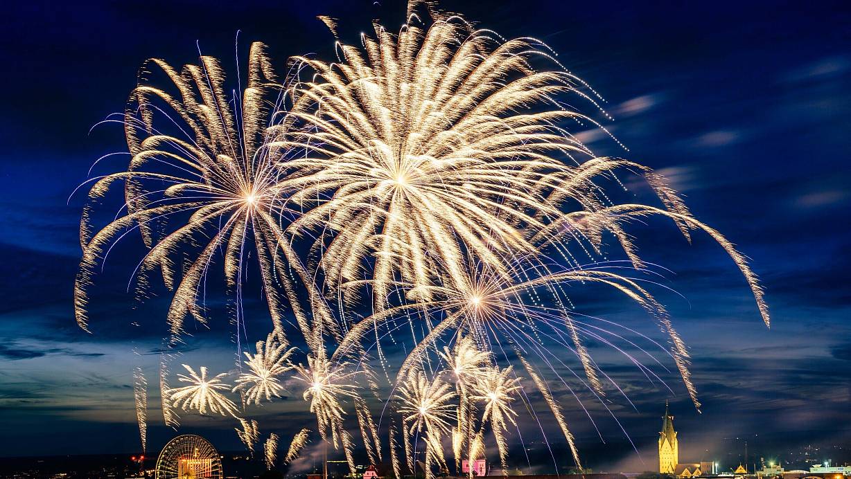 Mehr Glück, auch wenn die Sicht etwas eingeschränkt war, hatten Besucher des Brüderkrankenhaus-Parkdecks, wie das Bild unseres Fotografen Besim Mazhiqi zeigt. Mit Blick aufs Riesenrad und den Dom bot sich eine traumhafte Szenerie mit dem bis zu 150 Meter hohen Lichterspektakel am Himmel und vor der Silhouette der City.