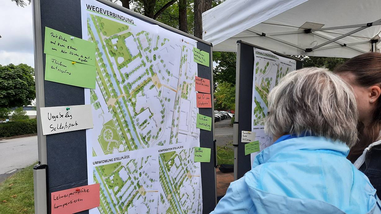 Einige Bürgerinnen und Bürger in Schloß Neuhaus nutzen die Gelegenheit, um ihre Wünsche mit in Planung der Umgestaltung einzubringen. Als Notiz wurden die Ideen an die Pläne angepinnt. | © Marc Schröder