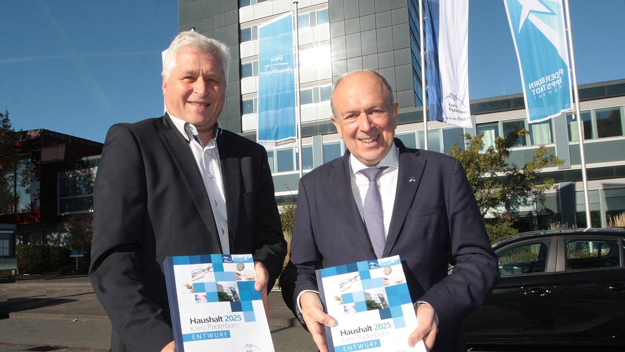 Ulrich Schadomsky (Amtsleitung der Kreis-Kämmerei) und Landrat Christoph Rüther (r.) präsentieren bei strahlendem Wetter den Haushaltsplanentwurf des Kreises Paderborn für 2025 mit nicht ganz so strahlenden Zahlen. | © Uwe Müller