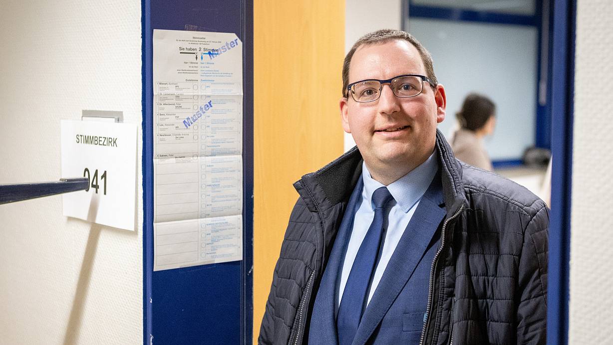 AfD-Direktkandidat Alexander Lex verbringt den Wahlabend als Wahlbeobachter im Wahllokal in der Paderborner Friedrich-Spee-Gesamtschule. | © Niklas Tüns
