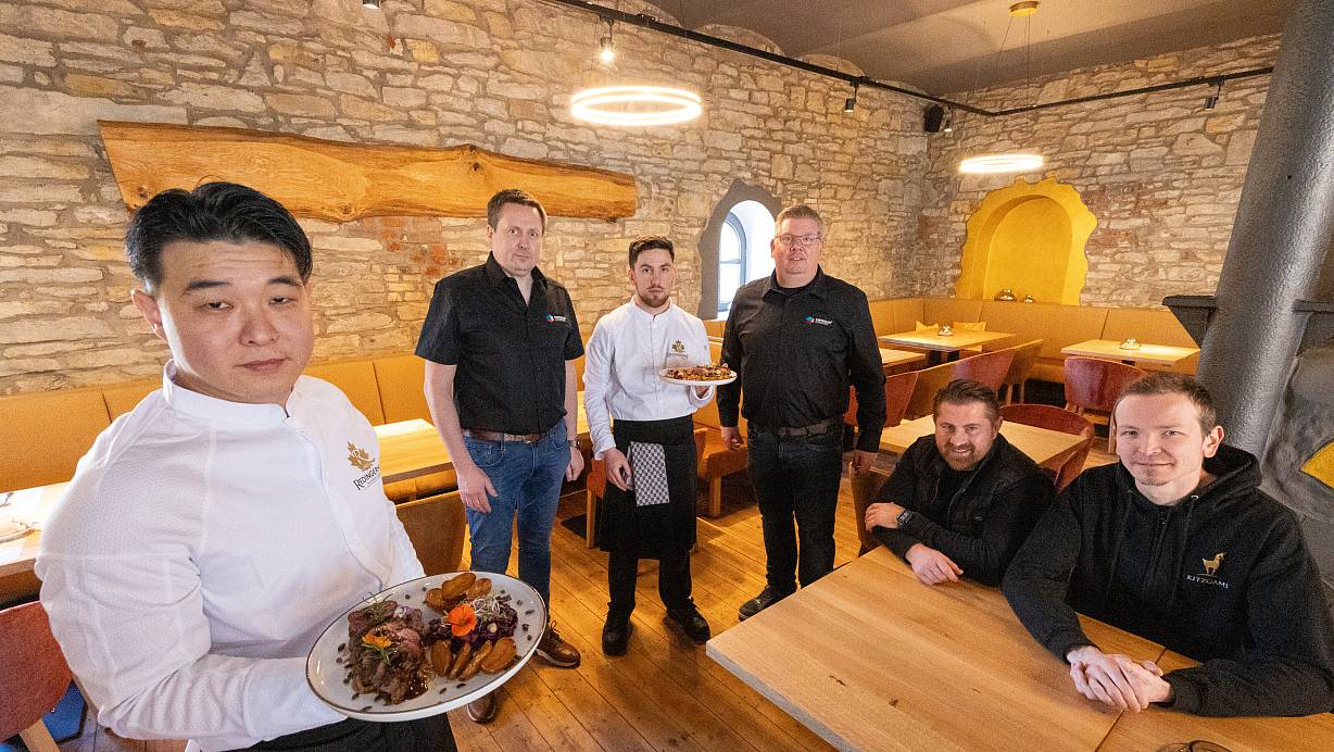 Freuen sich auf die Eröffnung des renovierten Redingerhofs zwischen Bad Lippspringe und Paderborn: Küchenchef Max Kim (v.l.), Guido Jöring (Festfalen), Koch Georgiy Kalayda, Sebastian Hora (Festfalen), Alexander Brozmann und Stefan Niermann. | © Niklas Tüns