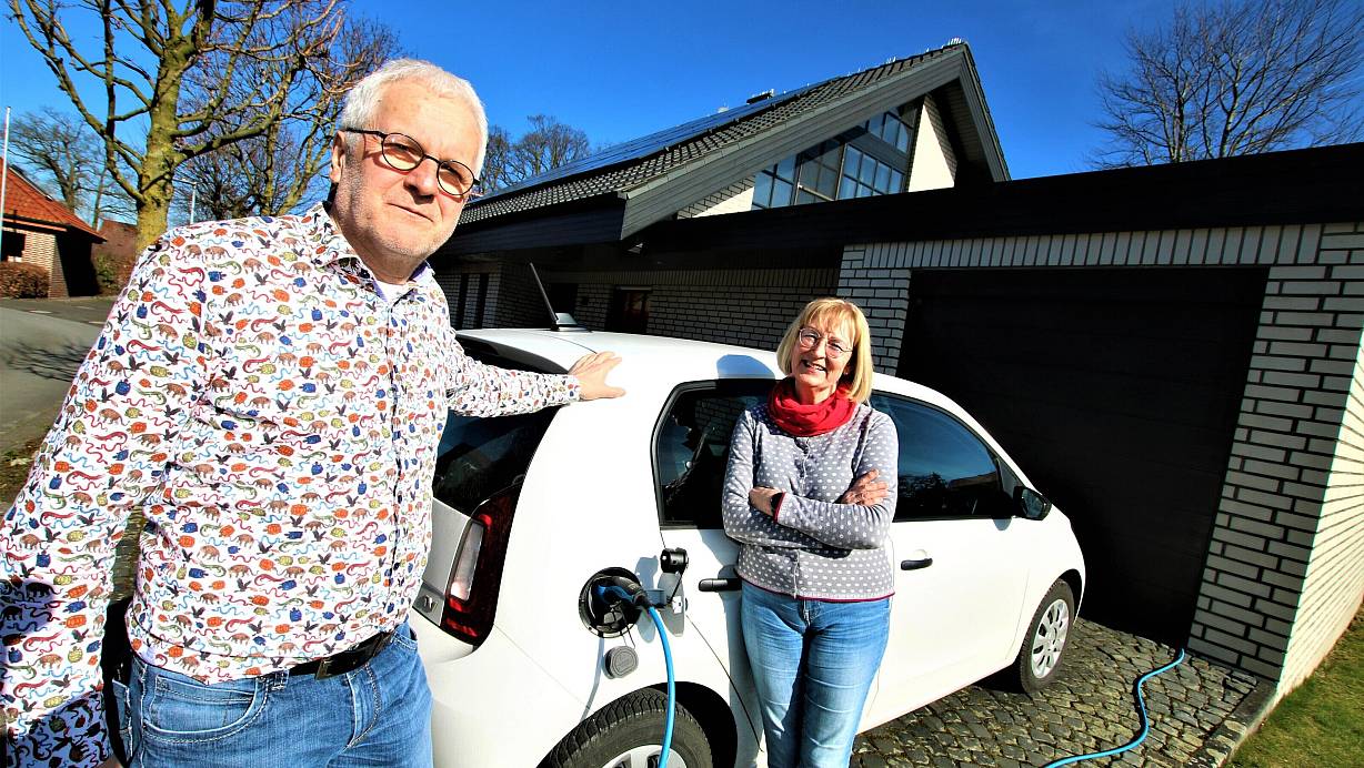 Regina und Heiner Brucksch mit ihrem E-Auto, das mit eigenem Solarstrom geladen wird. Das Delbrücker Paar setzt seit 20 Jahren auf Nachhaltigkeit. | © Rajkumar Mukherjee