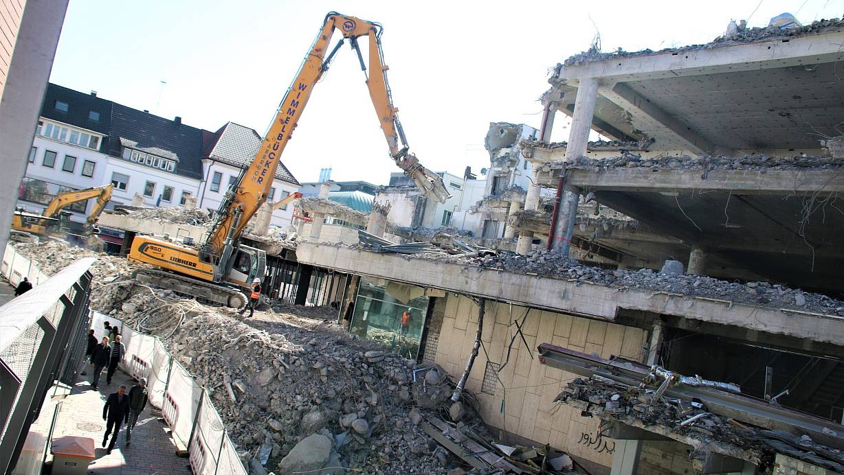 Noch einige Zeit werden Arbeiter mit einem großen Bagger die Reste der oberen Etagen des früheren Kaufhofgebäudes abreißen. | © Rajkumar Mukherjee