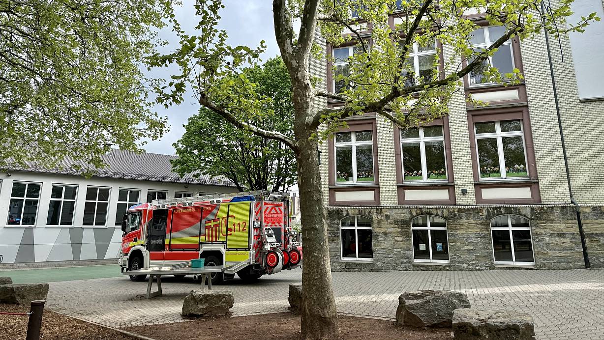 Um 10.08 Uhr wurde die Feuerwehr unter dem Stichwort „Zimmerbrand, Verrauchung in der Küche“ alarmiert. Gut 20 Kinder aus der Ferienbetreuung der Offenen Ganztagsschule (OGS) verließen in Begleitung ihrer Betreuer geordnet das Schulgebäude, sammelten sich in einer Ecke des Schulgeländes und warteten das Eintreffen der Feuerwehr ab, die mit einem großen Hallo begrüßt wurde.