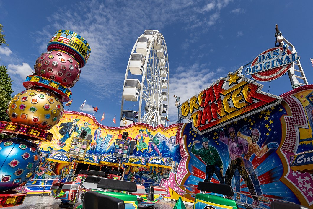 Einen Rundumblick über das Kirmesgelände und die Umgebung erhalten Fahrgäste aus den Gondeln des 38 Meter hohen Riesenrads „Royal“. „Das ist das größte transportable Riesenrad auf einem Wagen in Europa“, sagt Eigentümer Adolf Steuer. Die Stadt Paderborn als Veranstalterin nennt als weitere Attraktion das Fahrgeschäft „Break Dancer“.