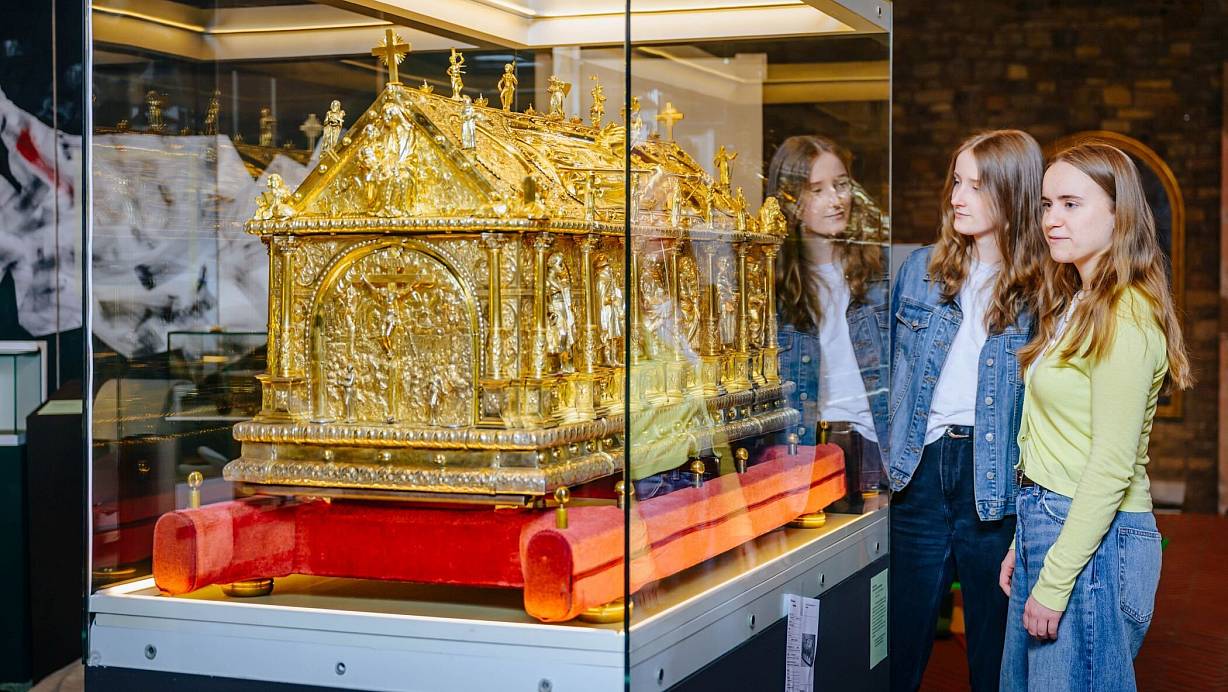 Auch der Liborischrein ist Teil der Ausstellung. In ihm werden im Paderborner Dom jedes Jahr die Reliquien des Heiligen Liborius von Le Mans, des Dom- und Bistumspatrons, den Gläubigen präsentiert und die Libori-Woche damit feierlich eröffnet. Kroker: „Den Schrein hier im Haus zu haben und ihn aus der Nähe zu betrachten, ist für mich etwas ganz Besonderes.“ Die Künstler Malte van de Water und Pei-Yu Chang haben im Inneren der Pfalz die Ausstellung mit Collagen gestaltet, die die Besucher nicht nur in Themenräume, sondern in ein eigens geschaffenes Bild hineinwandern lassen.