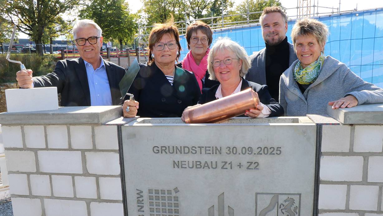 Wolfgang Feldmann (v. l.), Gabriele Willems, Martina Gerdes-Kühn, Simone Probst, Unipräsident Matthias Bauer und Sabine Kramm mit der Zeitkapsel der Grundsteinlegung. | © Holger Kosbab