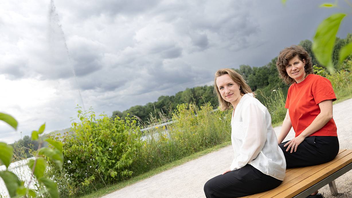 Die Kuratorinnen Marijke Lukowicz (l.) und Sophia Trollmann sitzen am Padersee. Beim Sich-Hinsetzen auf diese Bank schießt eine 20 Meter hohe Fontäne in die Höhe: Es ist die Arbeit von Jeppe Hein, die auch künftig für Interaktionskunst sorgen könnte. | © Niklas Tüns