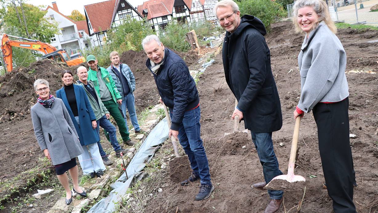 Beim ersten Spatenstich im Geisselschen Garten in Paderborn sind (v. l.) Claudia Warnecke (Technische Beigeordnete), Lea Lengeling (Projektleitung Amt für Umweltschutz und Grünflächen), Jens Holmer und Stefan Gerks (beide Verler Gartenbau), Jonas Volmer (Planungsbüro Volmer), Dieter Honervogt (stellvertretender Bürgermeister), Peter Carl (Büro Lohaus Carl Köhlmos) und Jessica Schütte (Leiterin Amt für Umweltschutz und Grünflächen). Die Steine im Boden zeigen den Verlauf der historischen und auch künftigen Mauer. | © Holger Kosbab