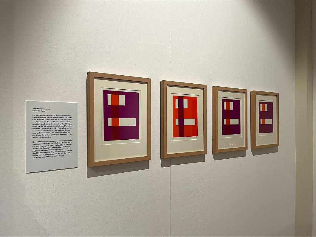 Außerdem werden die Kunstwerke von Benediktiner Mönch Stephan Oppermann ausgestellt. Er demonstriert auf seinen Bildern die Farbe Lila, die aus den zwei Farben Rot und Blau besteht. „Die Farbe Rot steht hierbei für den Körper, das Blut, den Sterbeprozess. Das Blau steht für den Himmel“, erklärt Annalena Müller, Assistenz der Geschäftsführung des Diözesanmuseums. Auch die Farbe Orange ist zu erkennen, die laut Müller für das Leben stehen soll. „Gegen eine Spende können die Exemplare sogar mit nach Hause genommen werden“, sagt Müller.