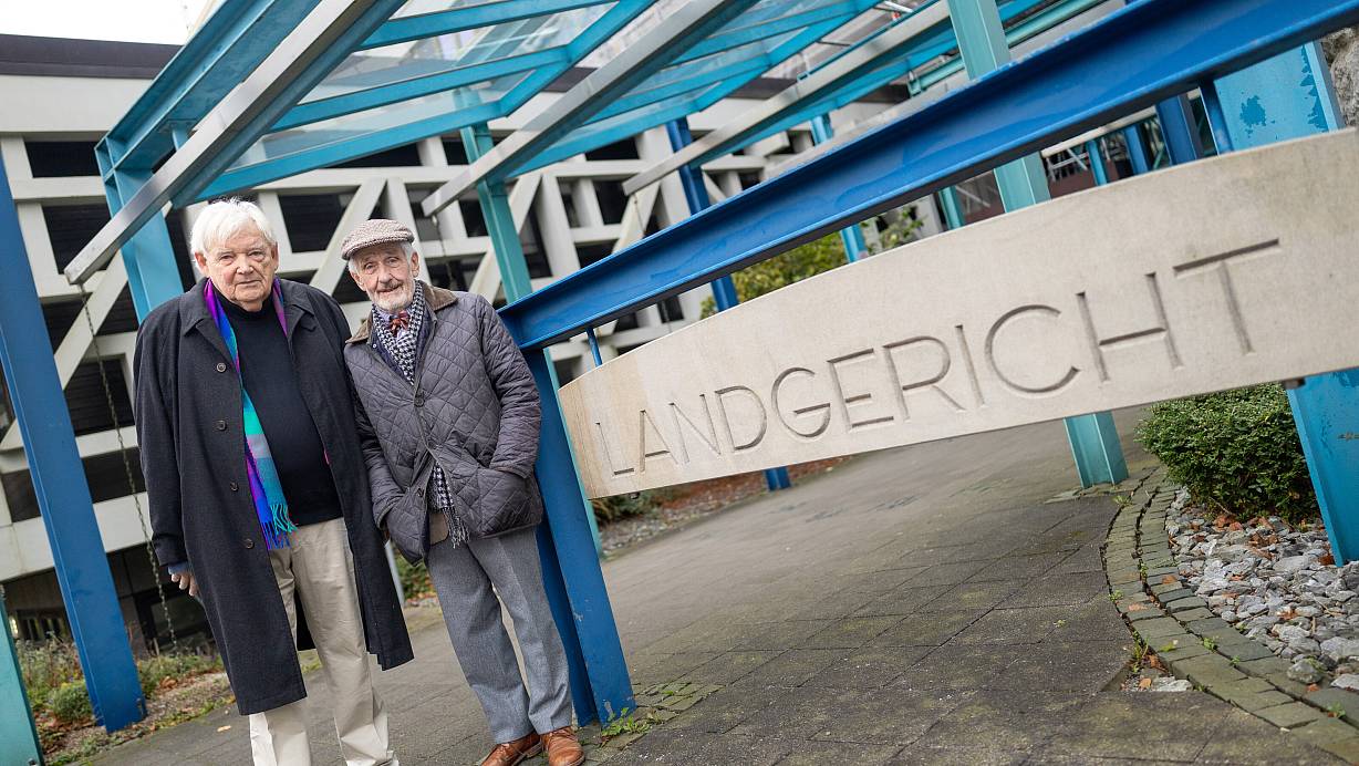 Der Paderborner Künstler Wilfried Hagebölling (l.) und sein Rechtsanwalt Peter Raue stehen vor dem Bielefelder Landgericht. | © Niklas Tüns