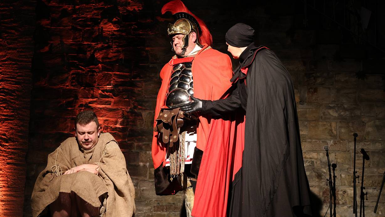 Nach der musikalischen Einstimmung warteten alle gespannt auf die berühmte Szene zwischen St. Martin – gespielt von Simon Lea –, dem Bettler (Justin Lea) und dem schwarzen Begleiter. Letzterer wurde in diesem Jahr zum ersten Mal von Edith Lea verkörpert. „Somit ist die Besetzung jetzt fest in familiärer Hand“, sagte Simon Lea vor der Aufführung mit einem Lachen. Die drei eingespielten Familienmitglieder schafften es durch ihre Rollen, die Legende der Mantelteilung berührend darzustellen. Das Publikum dankte es mit viel Applaus.