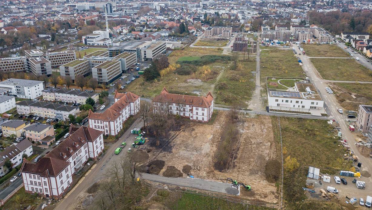 Auf dem Baufeld rechts von den alten Kasernengebäuden entsteht in den nächsten Monaten der Bürgergarten. Angrenzend an die Kita (helles Gebäude rechts) wird der Parkour gebaut. | © Niklas Tüns