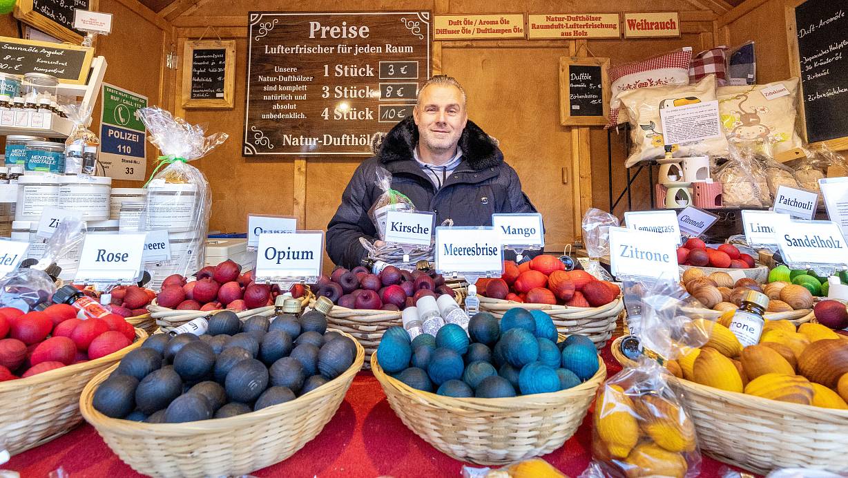 Janusch Jennebach aus Delbrück vertreibt auf dem Paderborner Weihnachtsmarkt Natur-Dufthölzer. | © Niklas Tüns