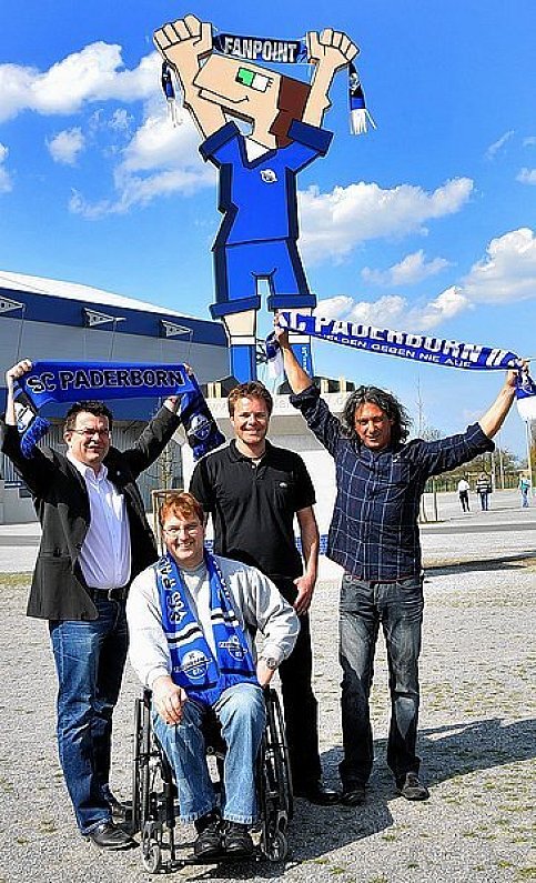 Schönes aus Beton: Stattliche sechseinhalb Meter ist das Kunstwerk des Paderborners Herman Reichold groß und 40 Tonnen schwer – davon stecken 30 allein im Sockel. Die Alfener Stanecker GmbH hat es nach einer Idee des Paderborner Künstlers gefertigt. Herman selbst sorgte für die Farbe für den Recken, der einen jubelnden SCP-Fan symbolisiert. Der Schal, den der Riese gen Himmel reckt, kann bei besonderen Anlässen gewechselt werden.