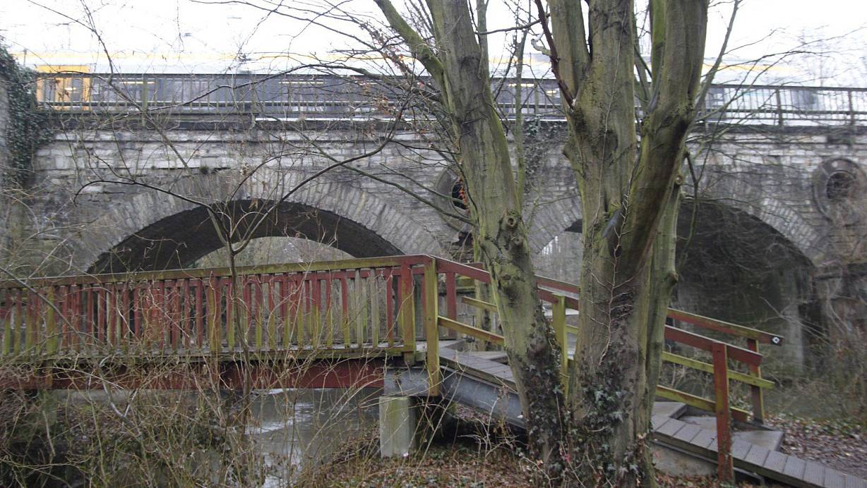 Am Ende des Franz-Kleine-Parks führt eine Holzbrücke über den Wellebach. Hier steht die alte Eisenbahnbrücke aus der Mitte des 19. Jahrhunderts. | © Karl Finke