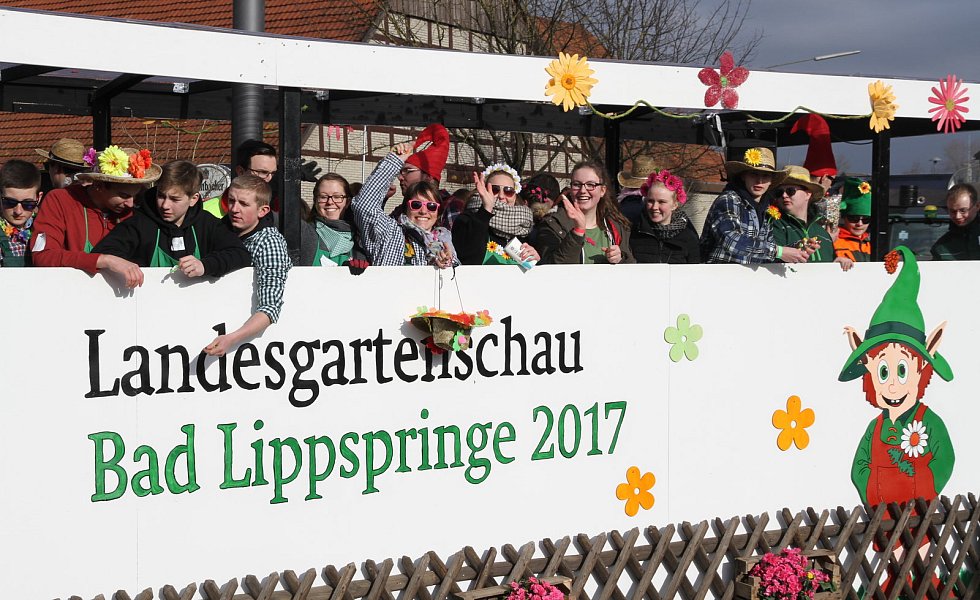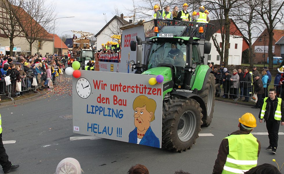 Bei der Festwagengestaltung waren auch in diesem Jahr keine Grenzen gesetzt worden. Angefangen von lokalen Themen bis hin zur Weltpolitik, es war alles dabei. So hatte die KLJG aus Bad Lippspringe einen Wagen zum Thema Landesgartenschau gebaut, die Lipplinger Jungs zeigten der Bundeskanzlerin, wie man eine Baustelle zügig beendet und die Jungschützen aus Schöning ließen ahnen, was sie mit ihrem Motto Mexico und „Knolli Knolli Schabau Mexico", von Trumps Mauerbauplanungen halten.