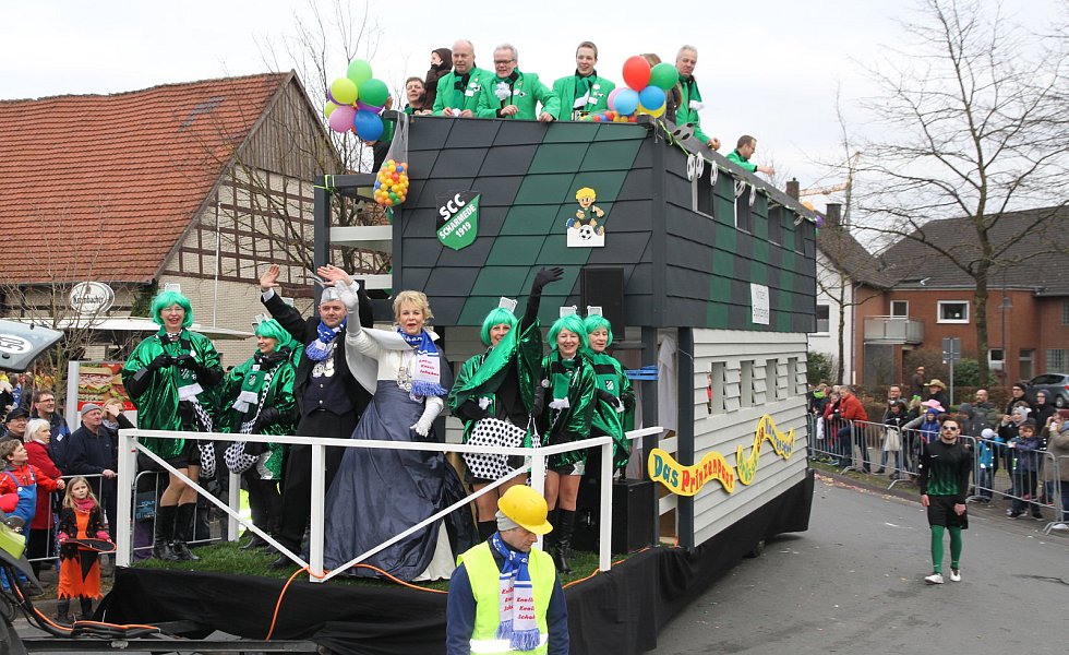 Einen ganz besonderen Einfall hatte aber das Prinzenpaar Rüdiger „der Zielstrebige" und Silke „die Herzliche" Richter. Bezogen auf das neue Sportgelände in Scharmede haben sie mit ihren Freunden auf den neuen Prinzenwagen einen verkleinerten Nachbau des neuen Sportheims erstellt. Dieser Nachbau wird nach Karneval als vom Prinzenpaar gespendetes Kinderspielhaus am Sportplatz aufgestellt.