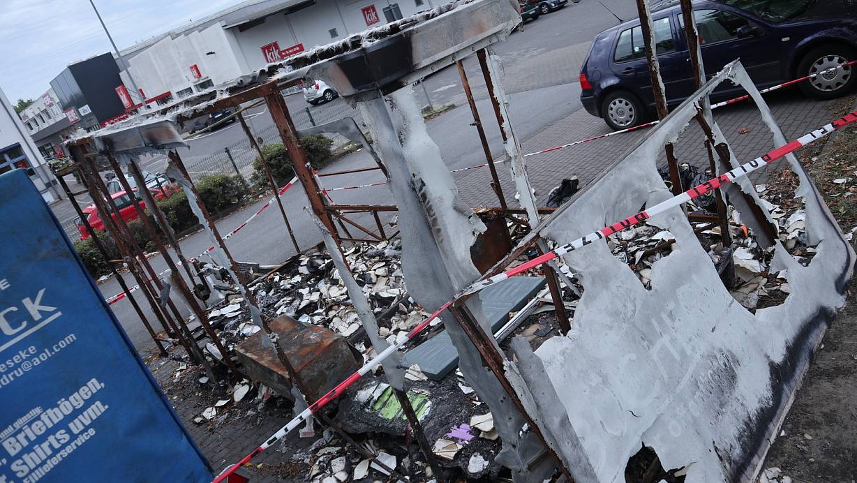 Parkplatz-Ruine: Der abgebrannten "Bücherwurm"-Anhänger fällt den Kunden der umliegenden Märkte und des Ärztehauses auf. Das Absperrband der Polizei ist noch da. Die Ermittlungen sind aber abgeschlossen. | © Jens Reddeker