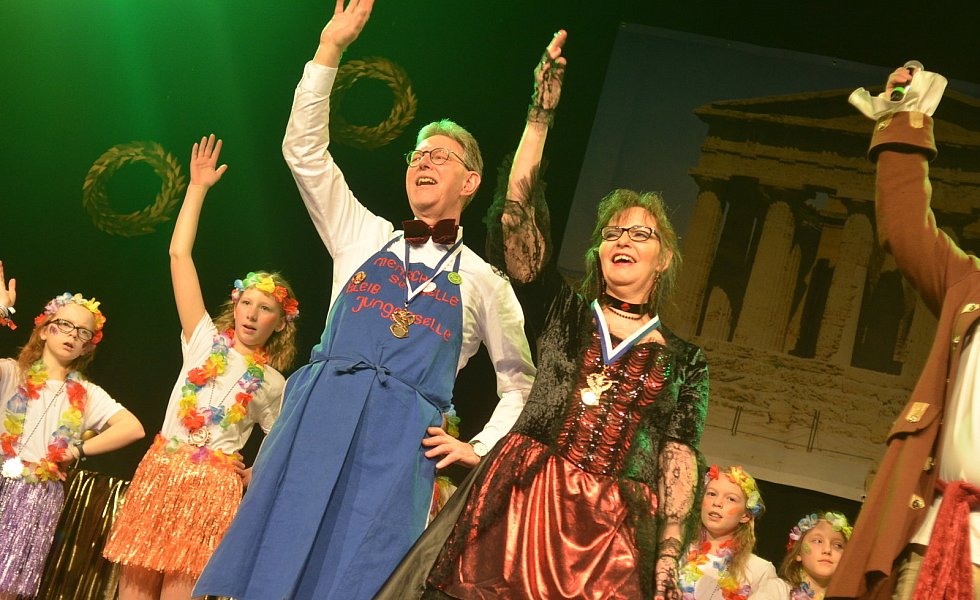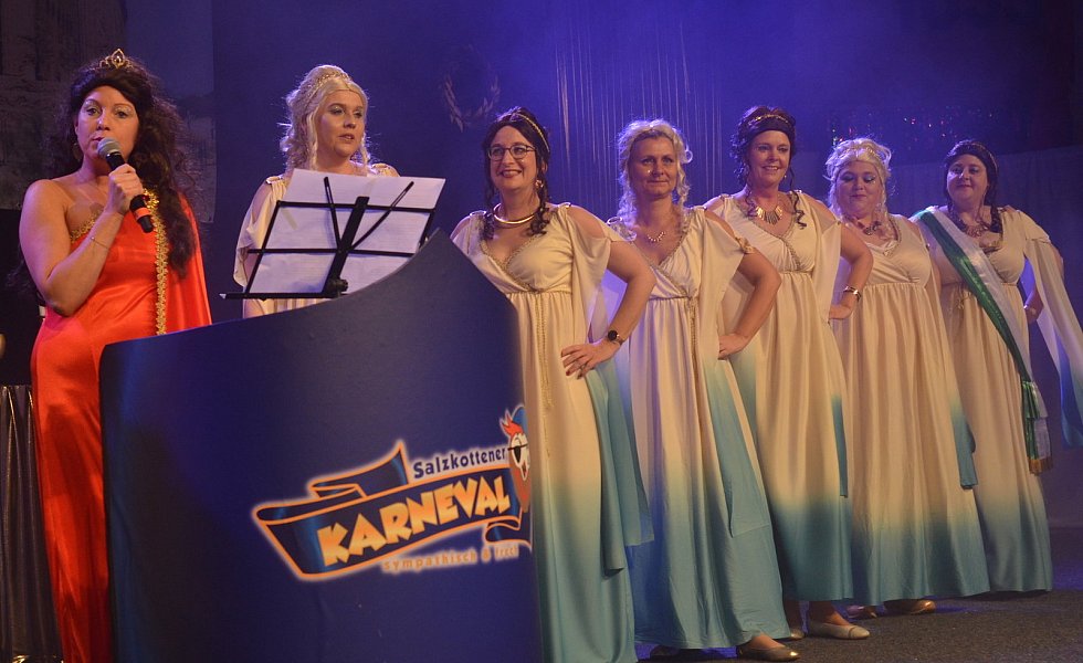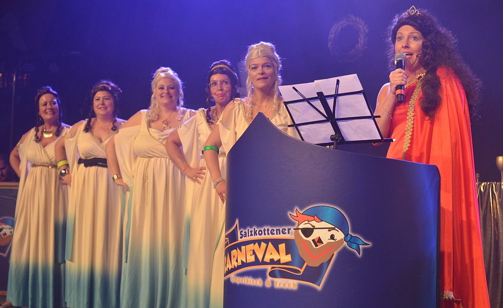 Deutlich weniger Platz benötigte der einheitlich gekleidete Elferrat, der in Abänderung der Tatsachen ein „Elfenrat" war. Er firmierte unter dem Motto „Vom Olymp herab gestiegen in göttlichem Gewand, regiert Steffi I. sportlich das Sälzer Narrenland". Was bewirkte, dass sich Prinzessin Stefanie Förster nebst ihrem rein femininen Gefolge themengerecht in Szene setzte.