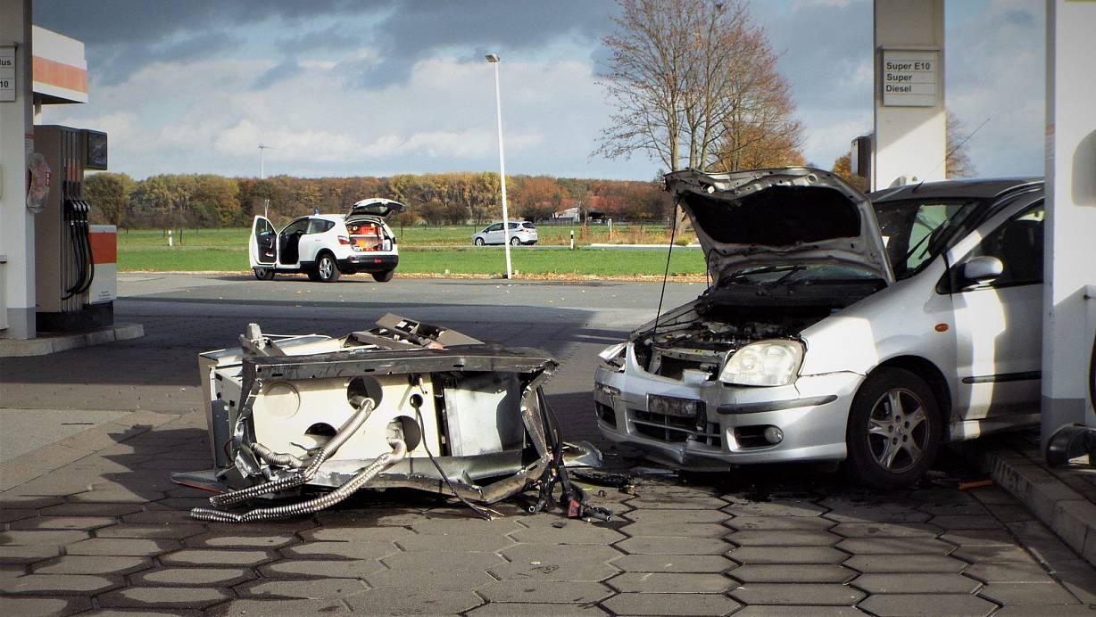 Auf dem Tankstellengelände kollidierte der Nissan mit einem Mercedes GLK der von eine 62-jährigen Frau gefahren wurde. Dann prallte der Almera frontal gegen eine Zapfsäule, die aus dem Fundament gerissen und völlig zerstört wurde.