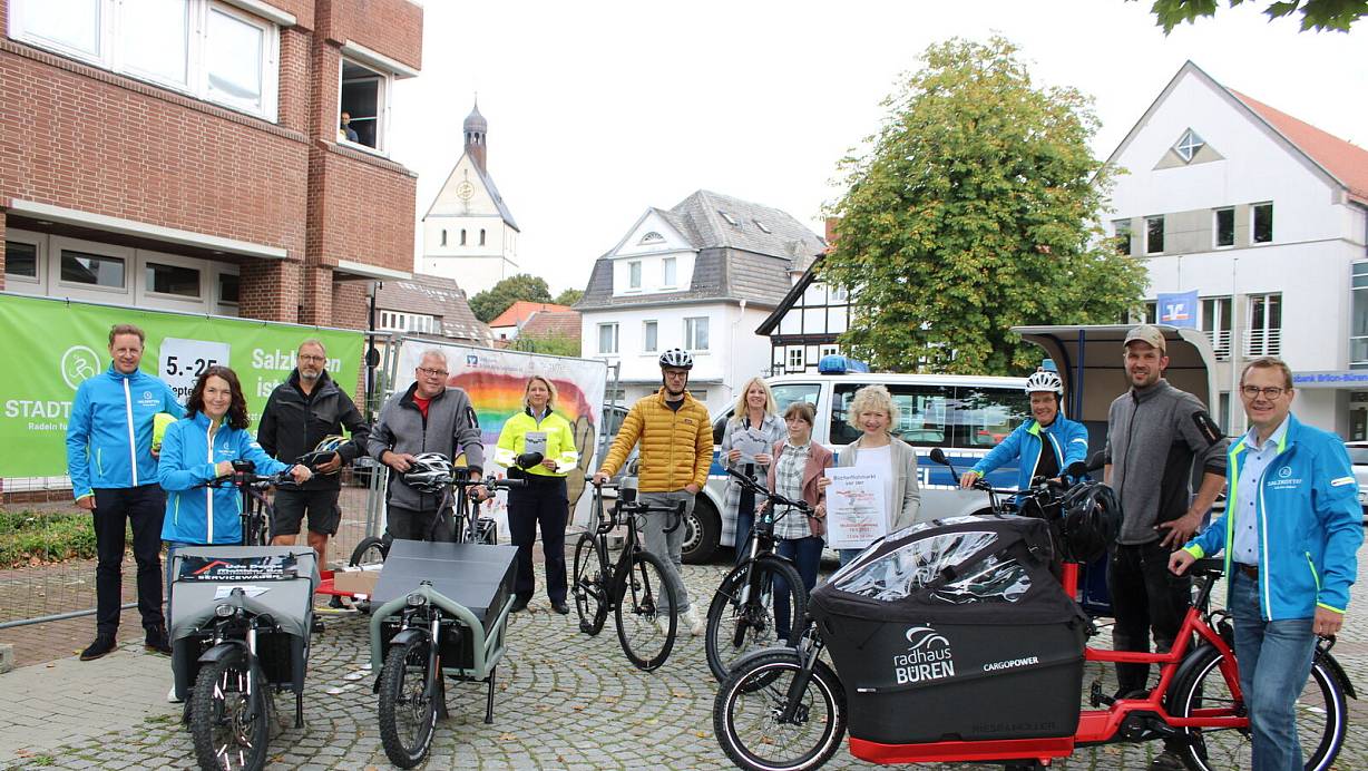 Salzkottens Bürgermeister Ulrich Berger (v.l.), Inge Adrian (Salzkotten Marketing), Ralf Dittrich, Matthias Ilse, Alexandra Dulisch (Polizei Paderborn), Martin Holzhausen (Hederlab), Stefanie Herting (Salzkotten Marketing), Birte Röttger (Gösken Style Raddesign), Maria Breuer (Stadtbibliothek), Schwester Hiltrud Wacker, Marius Richter und Martin Westermeier (beide Stadt Salzkotten) freuen sich auf den Mobilitätstag. | © Sebastian Beeg