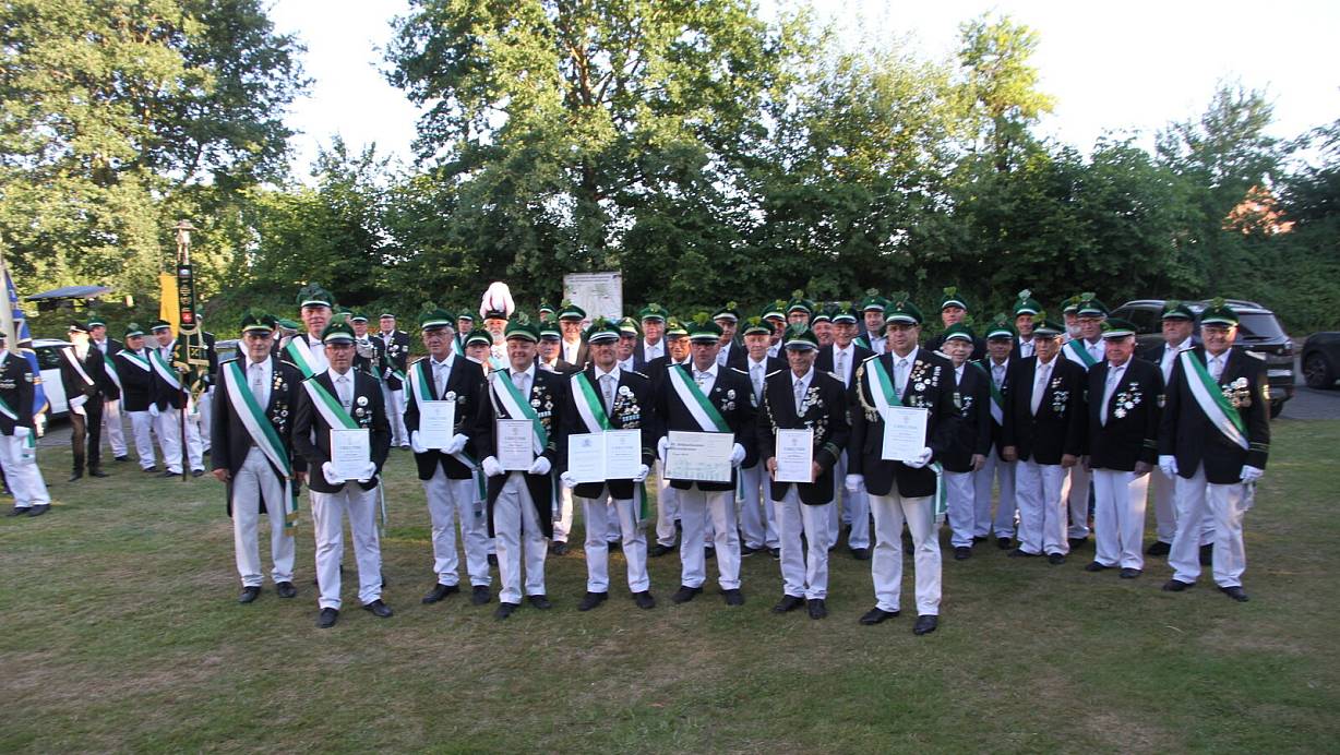 Zudem überreichte er Anton Salmen, Markus Zacharias, Werner Voß und Markus Plückebaum den Hohen Bruderschaftsorden und an Bernd Mertens und Peter Holzkamp das Silberne Verdienstkreuz.Für 20 Jahre Vorstandstätigkeit wurde Markus Plückebaum zum Ehrenoffizier ernannt.
