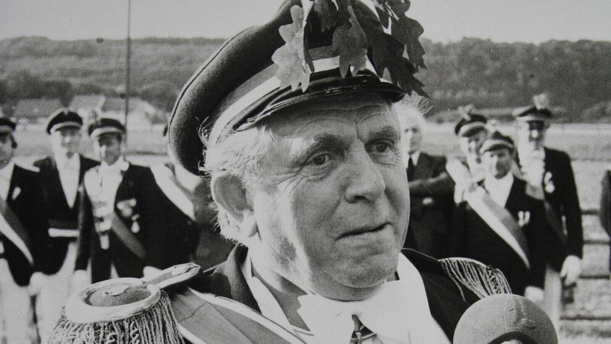 Felix Klingenthal war der letzte Landrat des Altkreises Büren und ein Schütze durch und durch. Hier steht der langjährige Kreisschützenoberst beim Kreisschützenfest in Wewelsburg im Jahr 1978 am Mikrofon. | © Johannes Büttner (Archiv)