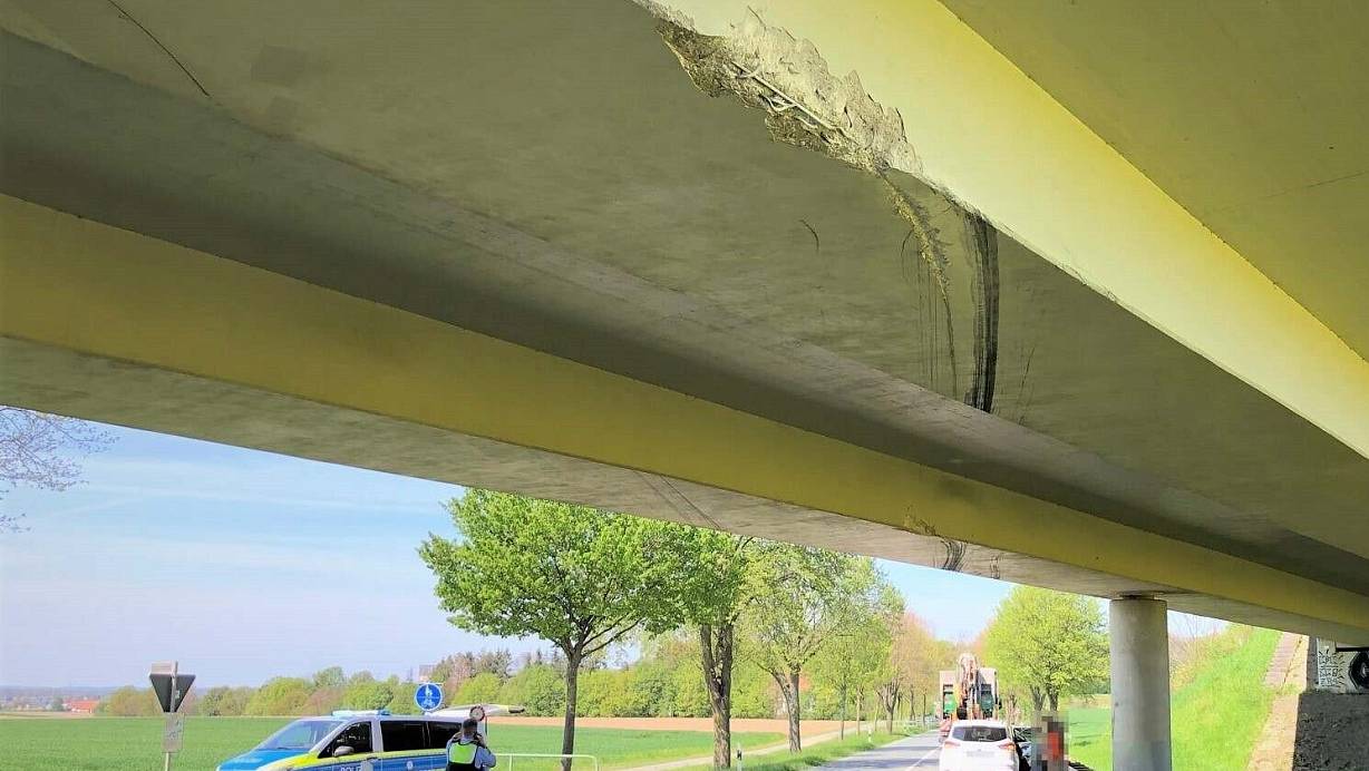 Salzkotten-Oberntudorf. Ein Baggertransport auf der Vom-Stein-Straße endete am Mittwochnachmittag mit hohem Sachschaden unter der L776-Brücke. Gegen 14 Uhr fuhr laut Polizeiangaben ein Lkw-Fahrer auf der Vom-Stein-Straße (L636) von Oberntudorf in Richtung Salzkotten. Der Lkw zog einen Tieflader, auf dem ein Bagger transportiert wurde.