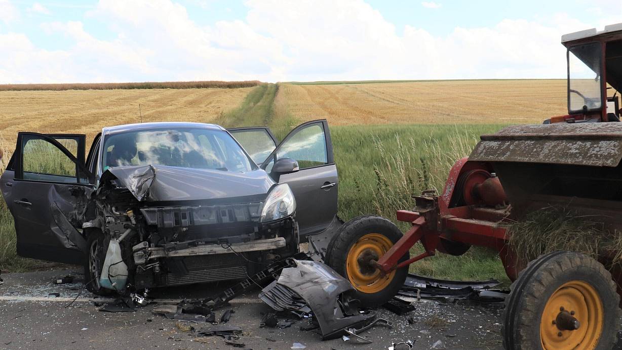 Die Fahrerin eines Renaults bemerkt zu spät, dass der Traktor abbiegen will. Es kommt zur Kollision.