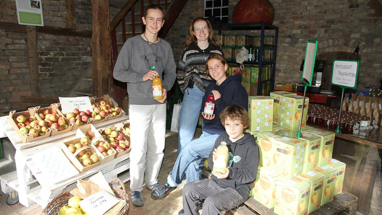 Franz Kafsack, Maren Schäfer, Philine und Emil Kafsack (v.l.) vom der Solawi-Genossenschaft bieten Säfte an. | © Johannes Büttner