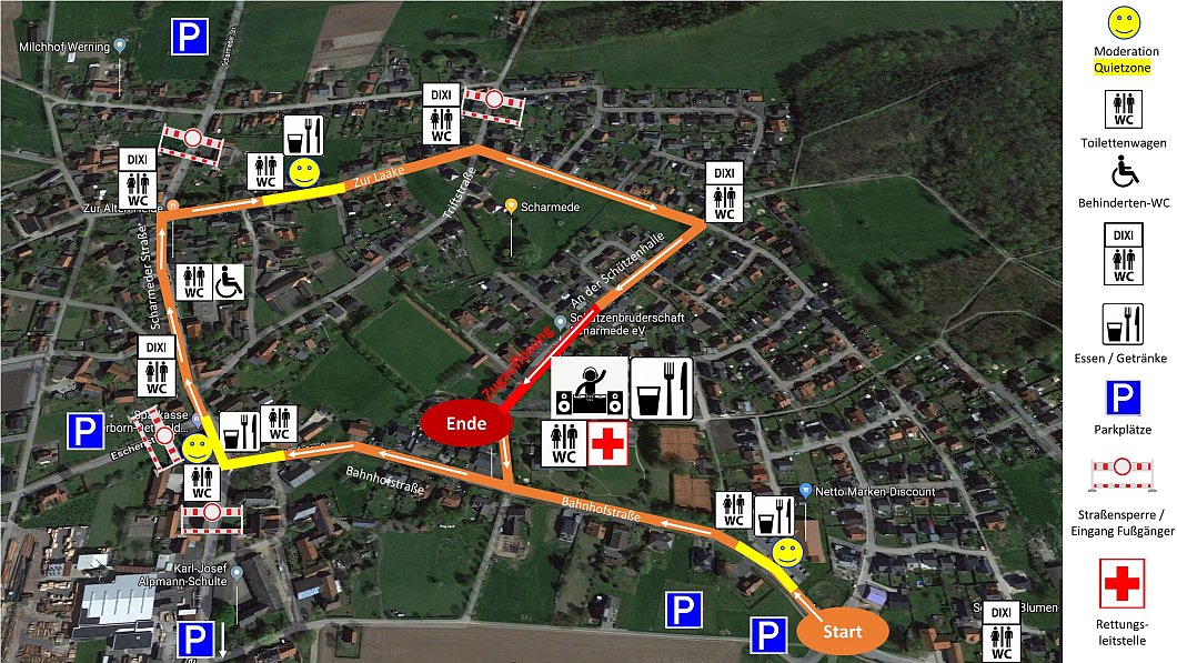 Vom Netto-Markt aus geht’s ins Dorf zur zweiten Moderationsstelle mit den beiden Entertainern Martin Herbst und Petra Wessel an der Kirche. Von dort geht es in Richtung Bentfeld, an der Gaststätte „Zur alten Heide“ Wiehmeier vorbei und nach rechts biegt der Umzug ab (Zur Laake) in Richtung der dritten Moderationsstelle am Hof Kallemeier. Dort mischen die Moderatorinnen Susanne Oschecker und Jessika Kaimann die Menge und den Umzug wieder kräftig auf.