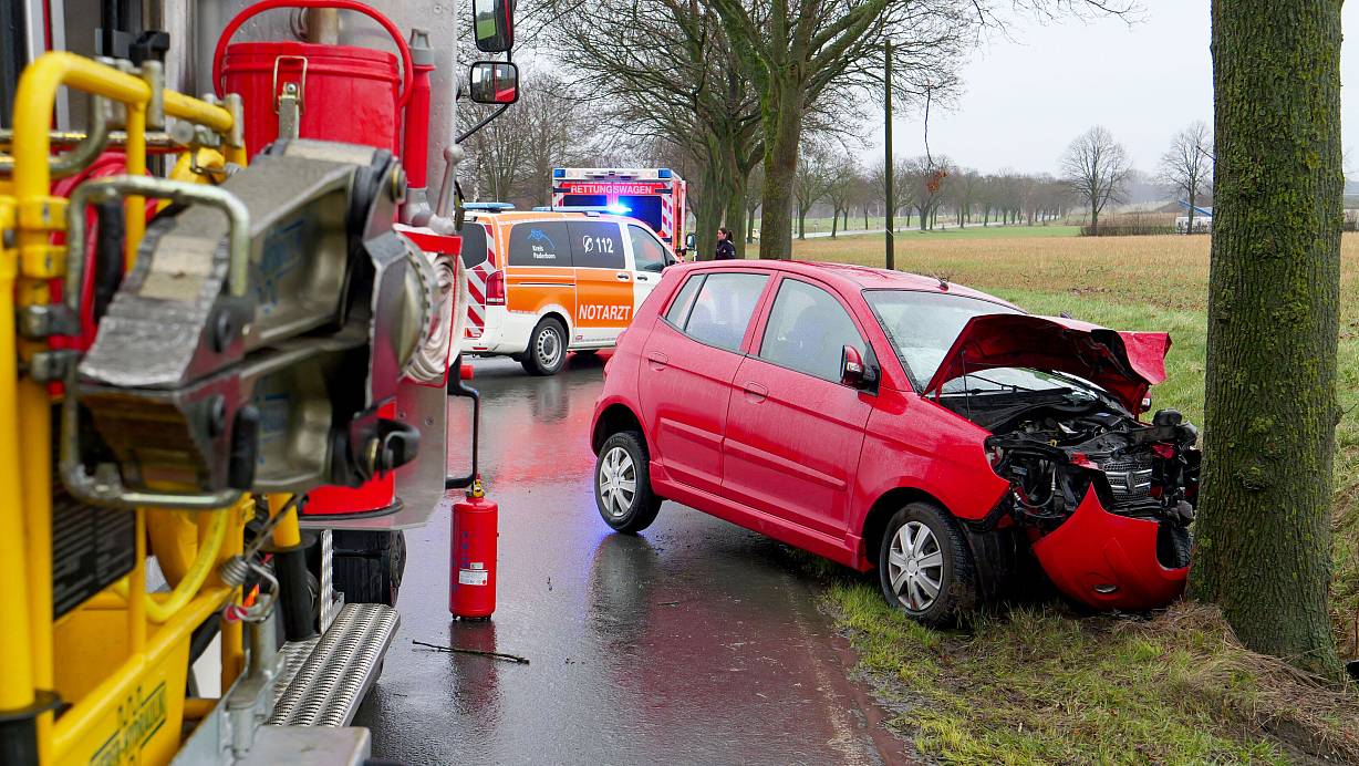 Der Kia-Kleinwagen prallte auf der Kreisstraße 37 (Kleiner Hellweg) bei Oberntudorf frontal gegen einen Baum. Dabei wurde der Fahrer schwer verletzt. | © Ralph Meyer
