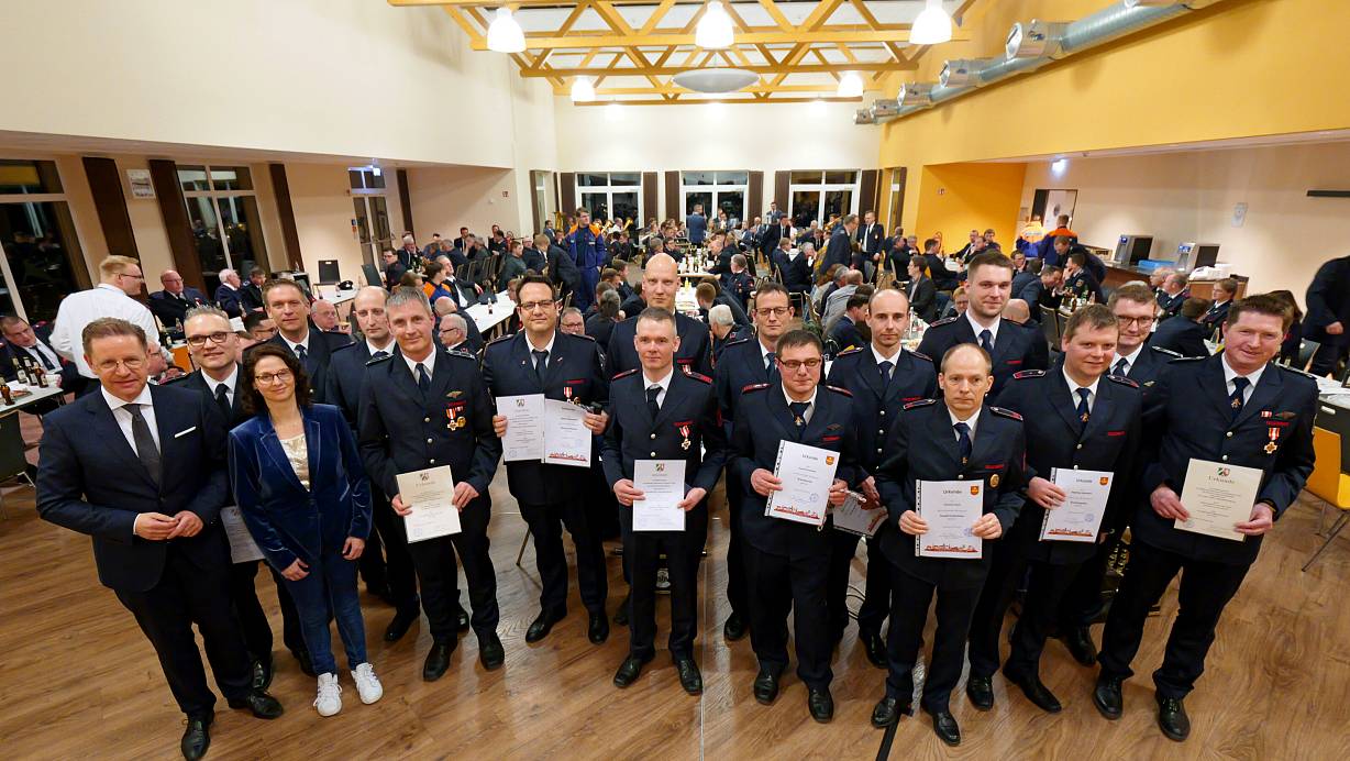 Die Ehrung von langjährig treuen Feuerwehrleuten und Beförderungen nehmen Bürgermeister Ulrich Berger (l.) und die stellvertretende Landrätin Verena Haese (3. v. l.) vor. | © Ralph Meyer