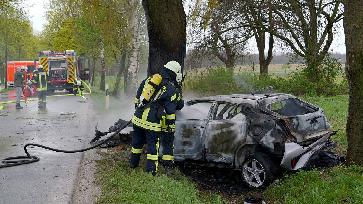 Ein Toyota kommt auf dem Kleinen Hellweg von der Straße ab und geht sofort in Flammen auf. Für die Insassen kommt jede Hilfe zu spät.