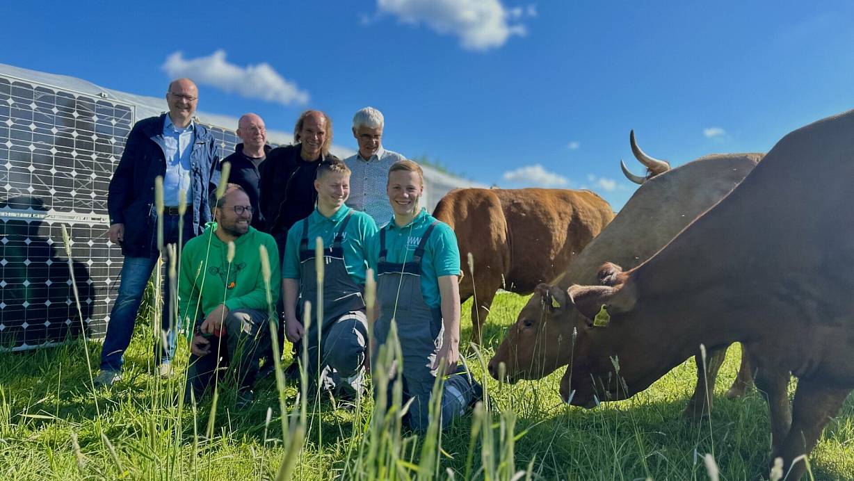 Zwischen Kühen und PV-Zaun im Kreis Paderborn: SoLawi-Mitglied Ulrich Büse (v. l.), Willi Ernst von der Biohaus-Stiftung, Ernst-Leopold Klipstein, Andreas Watzek (SoLawi Vauß-Hof), Marius Pötting (vorne, v. l., ebenfalls vom Vauß-Hof) sowie zwei Auszubildende von Westfalen Weser, Maximilian Knies und