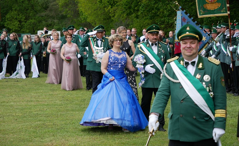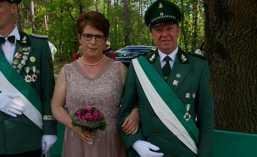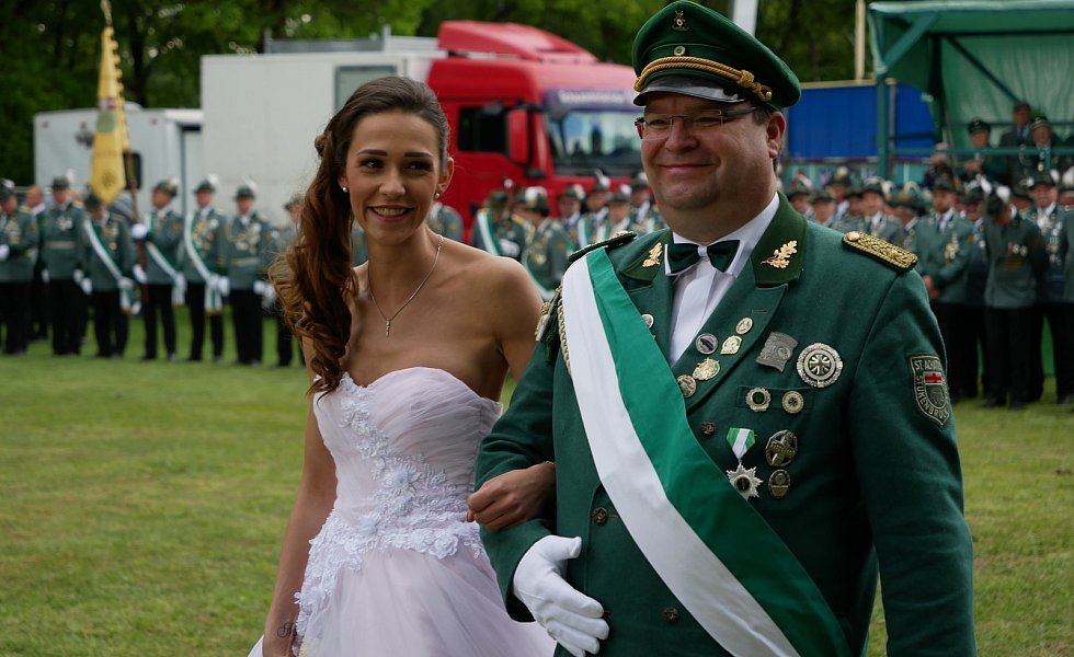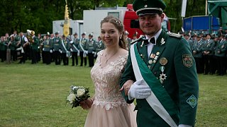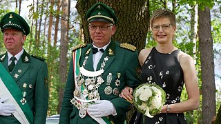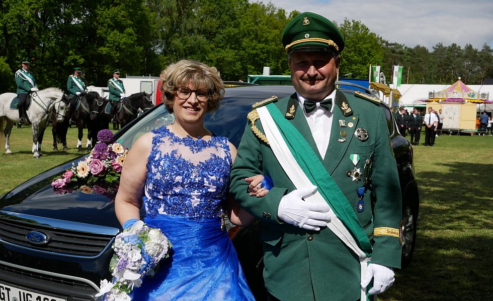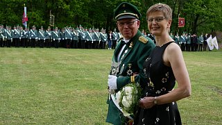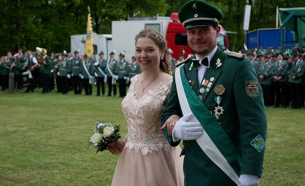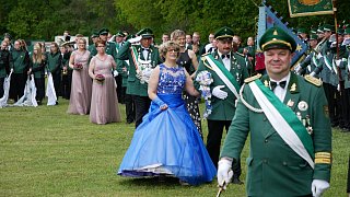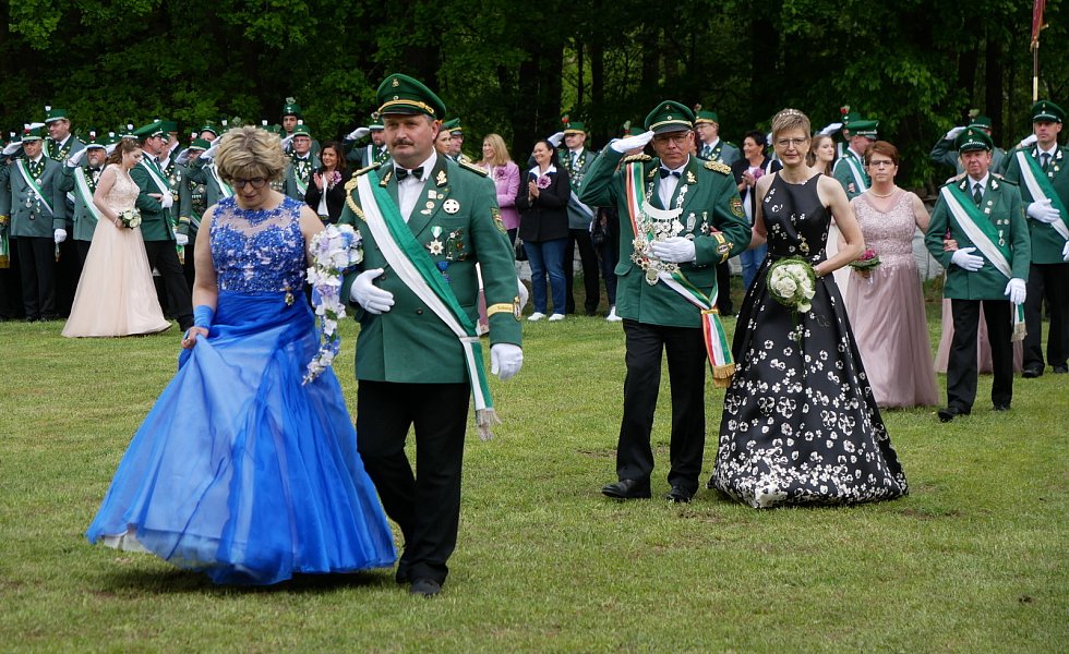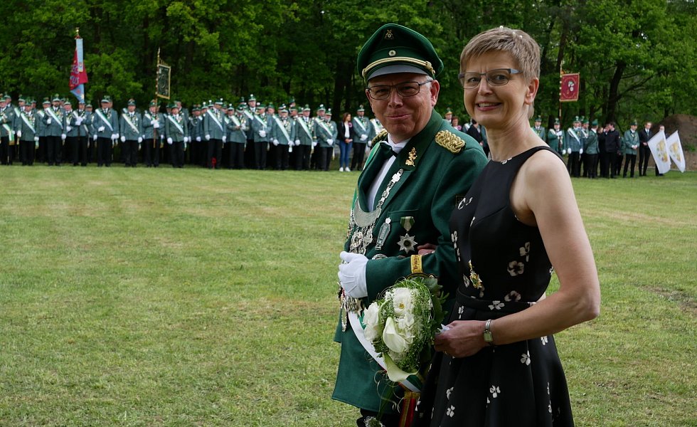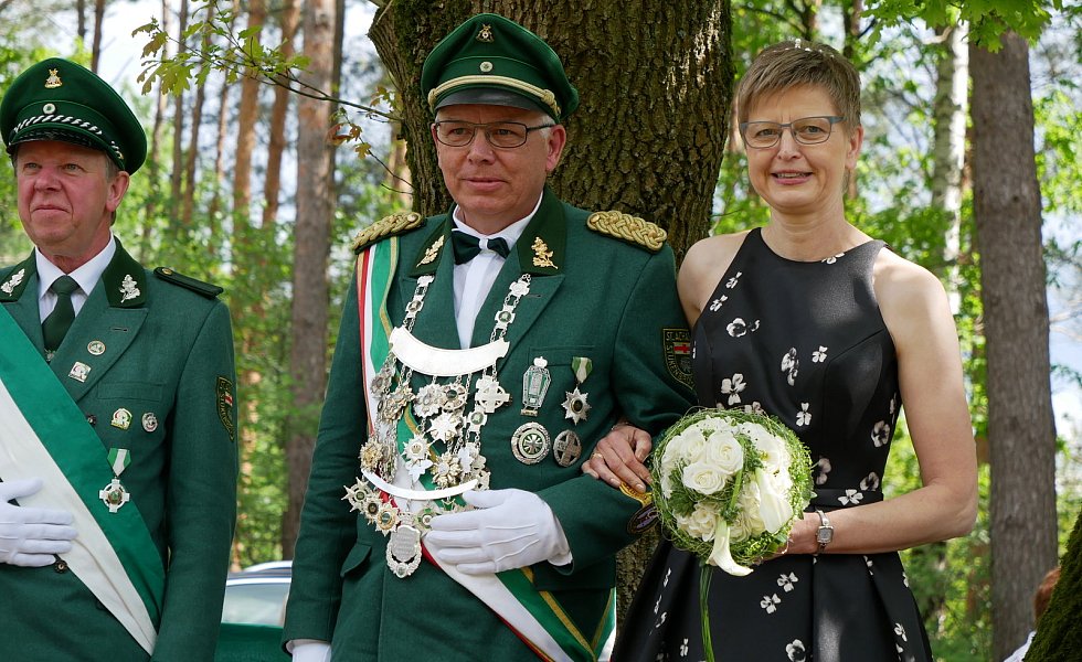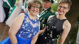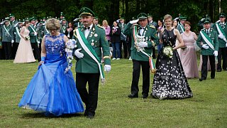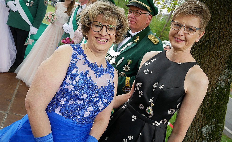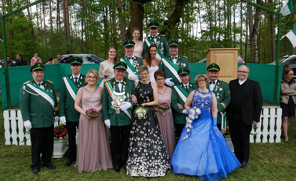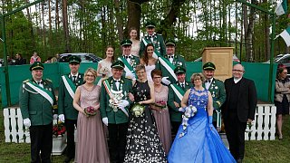 Der neue Hofstaat: Brudermeister Frank Hachmann (vordere Reihe, v. l.), Ehrenpaar Christian und Silvia Knocke, Königspaar Hermann-Josef und Hildegard Brummelte, Ehrenpaar Annegret Schapöhler und Dieter Lüke, Ex-Königspaar Gabi und Sven Teßmann sowie Präses Karl-Josef Auris. Kronprinzenpaar Jana Berg und Robin Schniedermann (2. Reihe, v. l.), Zepterprinzenpaar Annika Prigge und Andreas Hachmann. Apfelprinzenpaar Michelle Dreier und Marcel Mielemeier (hintere Reihe).