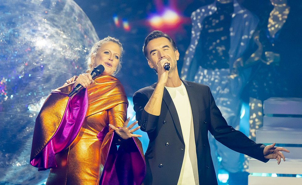 Barbara Schöneberger, Moderatorin, tritt mit Florian Silbereisen, Sänger, beim Eurovision Song Contest - Das deutsche Finale 2024 auf.
